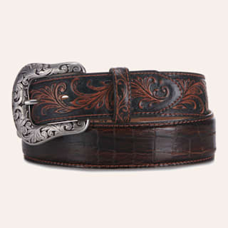 Tony Lama Men's Brown Tooled Floral Pattern Leather with Silver Buckle Western Belt