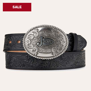 Justin Men's Black Tooled Leather with Silver Justin Logo Buckle Western Belt