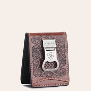 Ariat Men's Brown with Basketweave Tooling Bi-Fold Money Clip/Bottle Opener Wallet