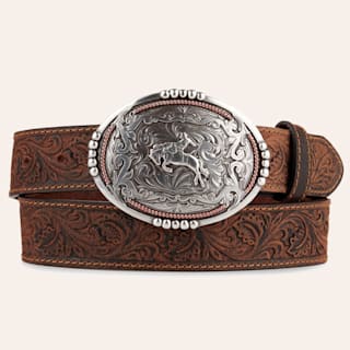 AndWest Men's Brown Tooled with Silver Bronc Rider Buckle Western Belt