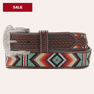 Nocona Men's Brown Leather Basket Weave with Sage Green Colorful Aztec Beading Western Belt