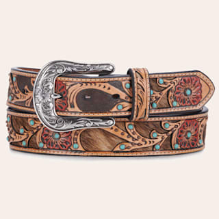 Ariat Women's Red Flower with Cowhide Inlay and Turquoise Embellishments Tooled Belt