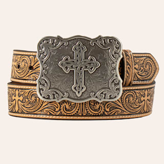 Nocona Men’s Tan Tooled Leather Belt with Silver Cross Buckle