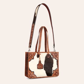 Angel Ranch Caramel Leather Tooled Sunflowers Cream & Black Hair on Hide Crossbody Concealed Carry Tote