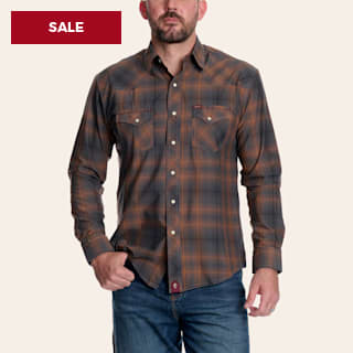 Rafter C Red Dirt Men's Gray & Brown Plaid Print Long Sleeve Pearl Snap Western Shirt