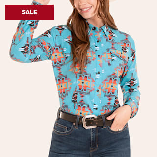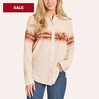 Rock & Roll Denim Women's Cream Horse Print Long Sleeve Pearl Snap Western Shirt