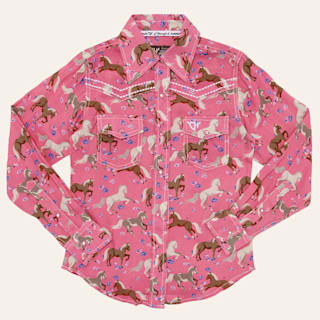 Cowgirl Hardware Girls' Pink Horses Print Long Sleeve Pearl Snap Western Shirt