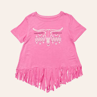 Cowgirl Hardware Girls' Pink Aztec Longhorn Skull Graphic Fringed T-Shirt