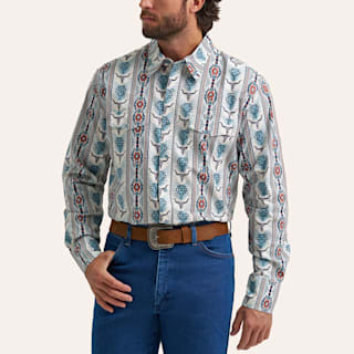 Wrangler Men's Checotah Gray Steer Head Aztec Print Pearl Snap Long Sleeve Western Shirt