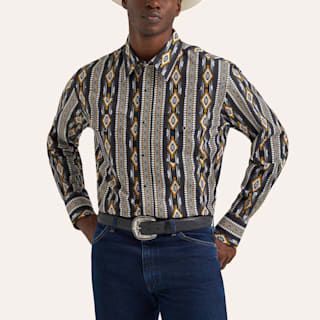 Wrangler Men's Checotah Black Aztec Stripe Print Long Sleeve Pearl Snap Western Shirt