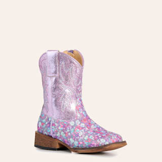 Roper Kids' Glitter Bloom Purple Floral Metallic Faux Leather Square Toe Cowboy Boots
