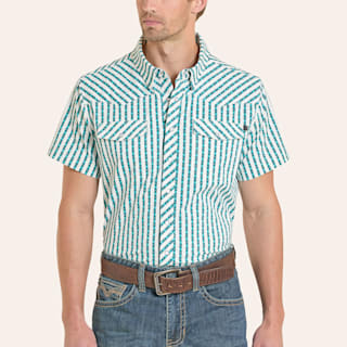 Rock & Roll Denim Men's Turquoise & White Aztec Stripe Print Pearl Snap TEK Western Shirt