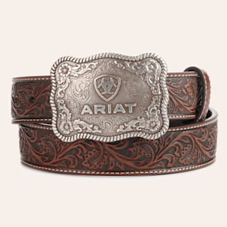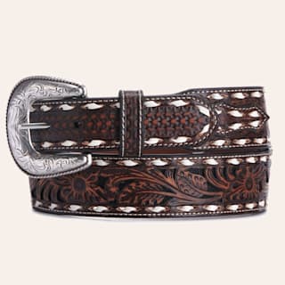 Ariat Men's Etched Silver Buckle & Brown Genuine Leather Floral Tooled Belt