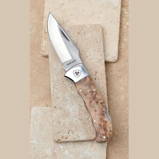 Ariat Medium Single Smooth Blade Natural Burl Wood Handle Folding Knife