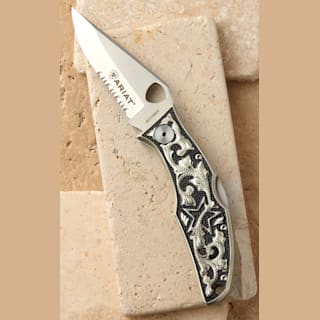 Ariat Integrated Hybrid Blade Silver & Black Engraved Handle Folding Knife