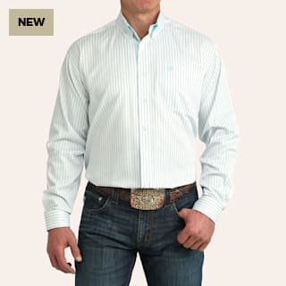 Cinch Men's White & Turquoise Stripe Print Long Sleeve Shirt