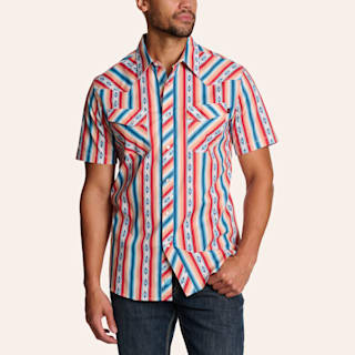 Rock & Roll Denim Men's Koe Wetzel Orange & Turquoise Aztec Stripe Pearl Snap Western Shirt