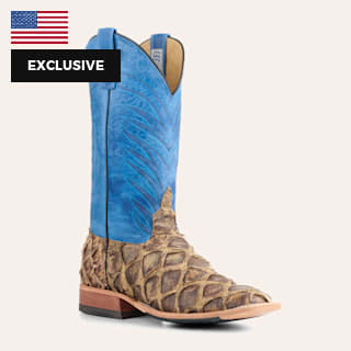 Cavender’s Men’s Blue Pirarucu and Brass Wide Square Toe Exotic Cowboy Boots