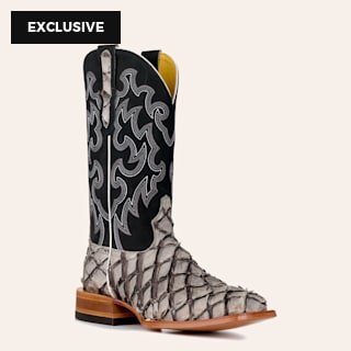 Cavender’s Men’s Gray Pirarucu and Black Wide Square Toe Exotic Cowboy Boots