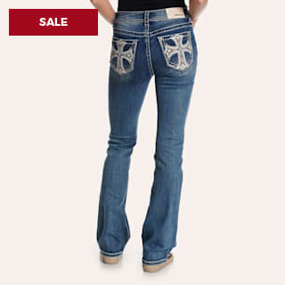 Grace in LA Women's Medium Wash Embroidered Cross Pocket Bootcut Jeans