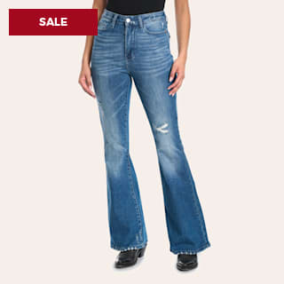 Rockin' C Women's Dark Wash Mid Rise Distressed Flare Jeans