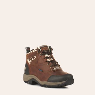 Ariat Women's Terrain Distressed Brown and Cow Print Waterproof Round Toe Lace Up Shoe