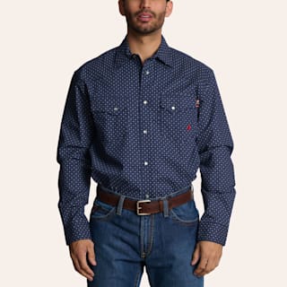 Forge Men's Navy Blue Geo Print FR Long Sleeve Pearl Snap Western Shirt
